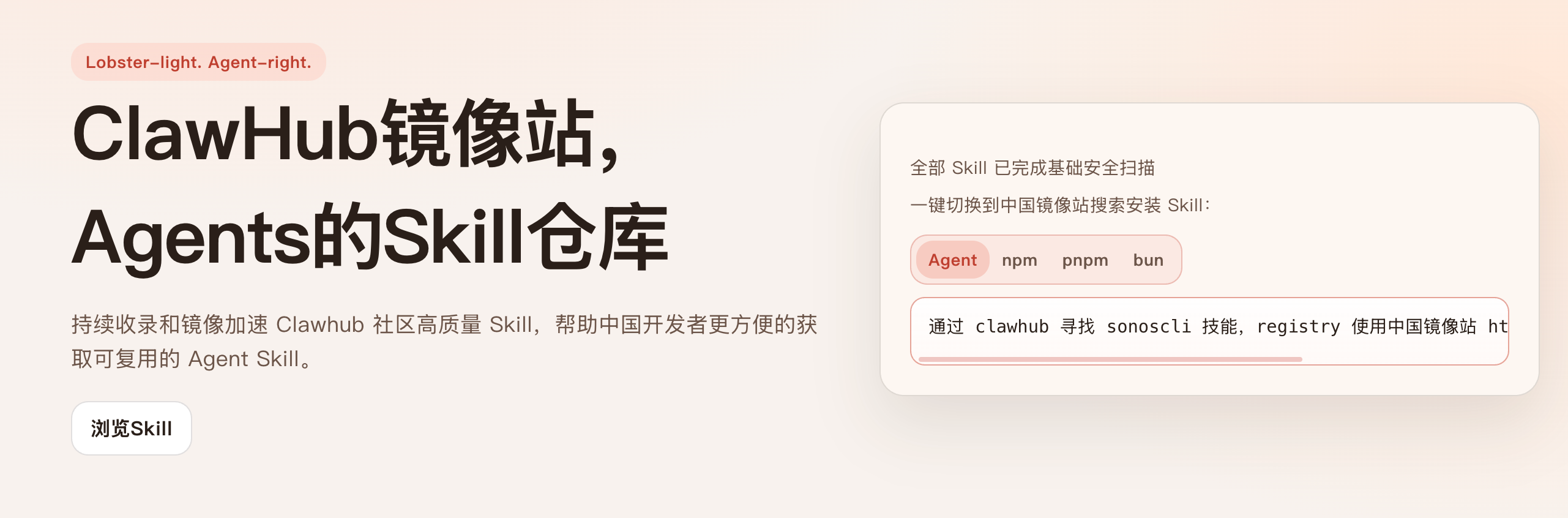 - 服务定位: 持续收录和镜像加速Clawhub社区高质量Skill,解决中国开发者访问不便问题。