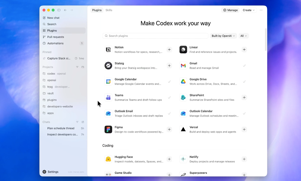 我们还发布了 90 多个额外插件,这些插件结合了技能、应用程序集成和 MCP 服务器,为 Codex 提供更多方式在您使用的工具中收集上下文并采取行动。开发者们会发现以下新插件特别有用:Atlassian Rovo(用于管理 JIRA)、CircleCI、CodeRabbit、GitLab Issues、Microsoft Suite、Neon by Databricks、Remotion、Render 和 Superpowers。