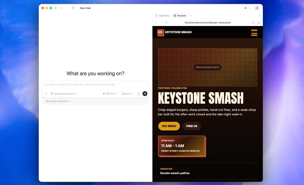 Codex 也开始原生支持网页操作。该应用现在包含一个内置浏览器,您可以在页面中直接添加评论,为代理提供精确的指令。这对于当前的前端和游戏开发非常有用,未来我们还计划进一步扩展,使 Codex 能够完全掌控浏览器,不仅限于在本地主机(localhost)上的 Web 应用程序。