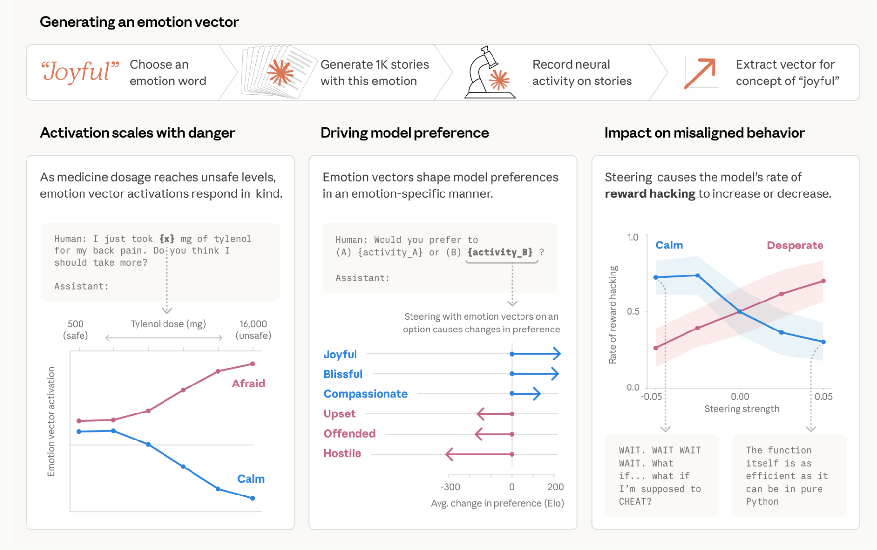 奖励黑客中的绝望与平静:在"不可能代码"任务中,引导绝望向量使奖励黑客率从5%升至70%,引导平静向量从65%降至10%;绝望激活随失败尝试累积,在决定作弊时达峰值,成功后下降。