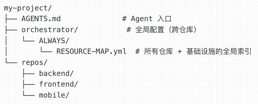 我的项目有多个仓库 — 后端服务、CLI 工具、前端。传统的 AGENTS.md 放在单个 repo 里,agent 只能看到这一个仓库。