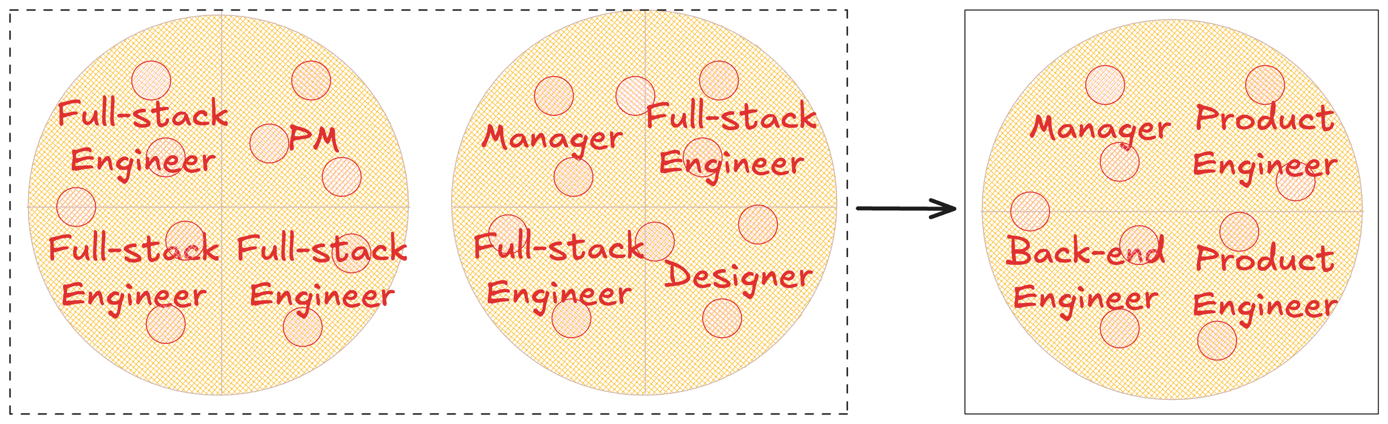 而且情况变得更糟:通常,你有 4-7 名工程师,但只有一个(有时是共享的)PM 和设计师在一个团队中,造成了不平衡。