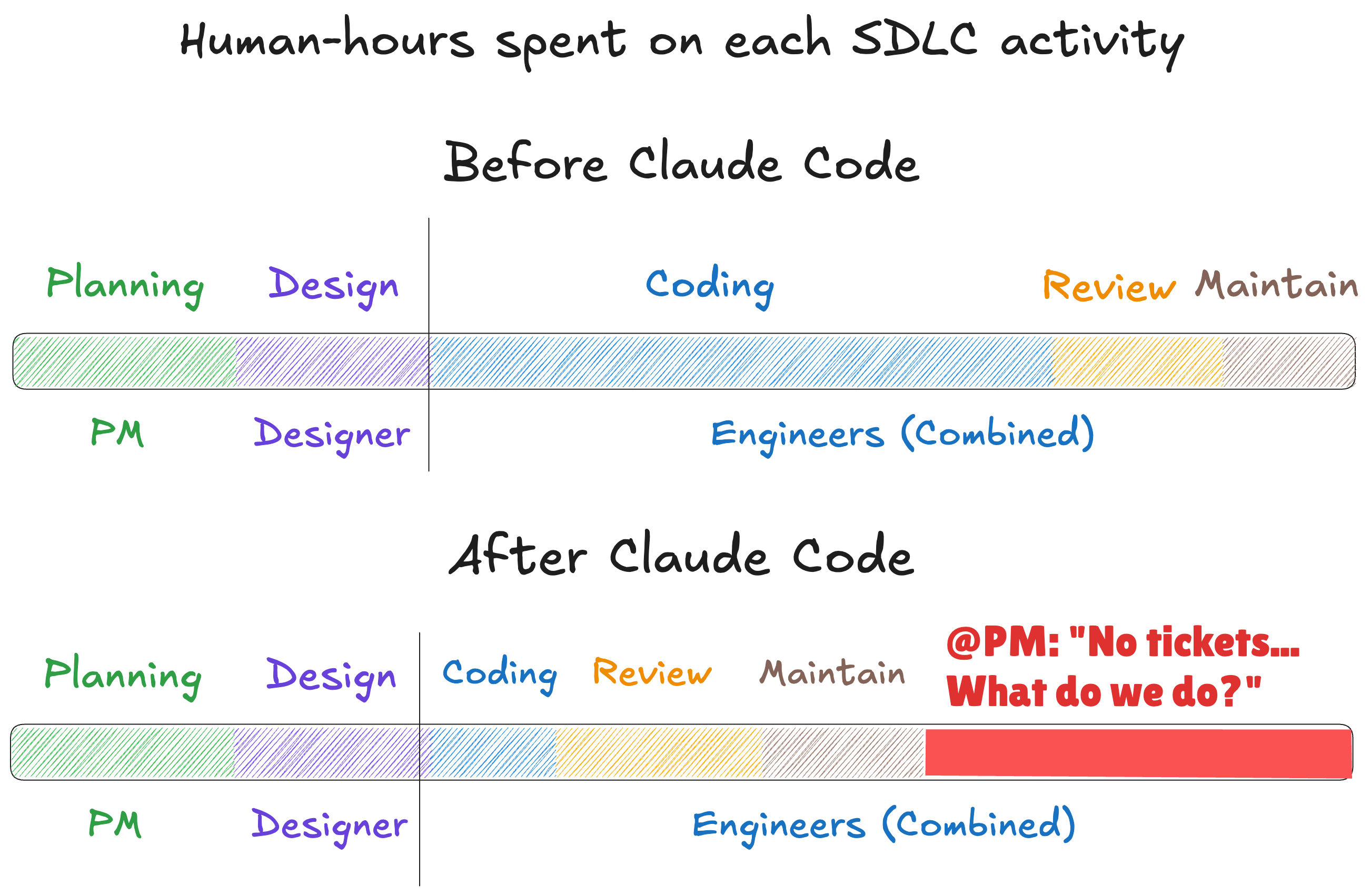 设计师和产品经理将继续存在,但不会成为特定团队的一部分。这个图表显示,我们仍然需要设计师。