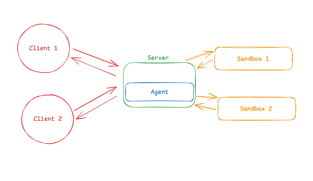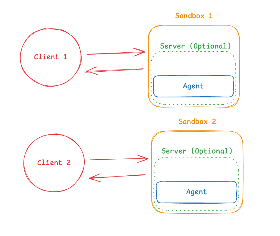 您构建一个带有代理框架预安装的 Docker 或 VM 镜像,在沙盒中运行,并从外部连接以发送消息。代理暴露一个 API 端点(通常是 HTTP 或 WebSocket),您的应用程序通过沙盒边界与其通信。