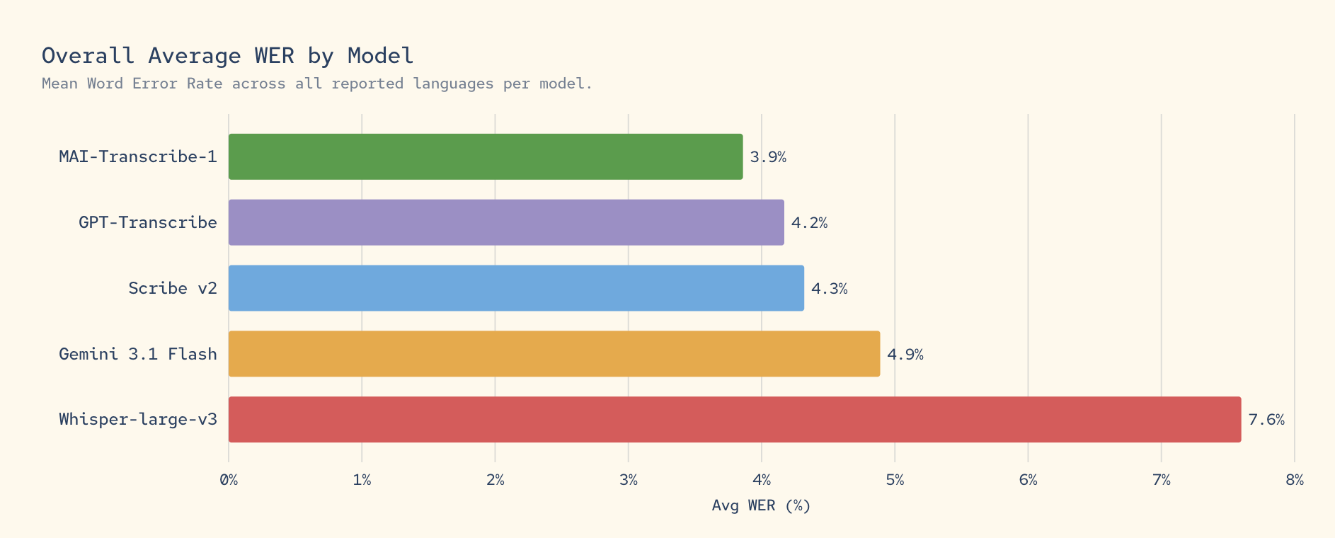 MAI-Transcribe-1 在行业权威基准测试 FLEURS 中,支持全球使用频率最高的 25 种语言,实现最先进的语音转文本(speech-to-text)转录功能。该模型专为嘈杂的真实环境设计,具备卓越的抗干扰能力。其批量转录速度比现有 Microsoft Azure Fast 服务快 2.5 倍,同时保持极高的准确性。因此,MAI-Transcribe-1 不仅是最精准的模型,更是速度最快的解决方案。目前,它已成为各大云服务商中性价比最高的大型语言模型。